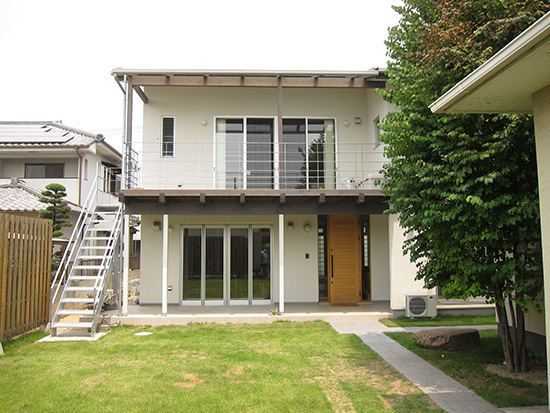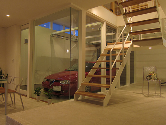 住宅11 2012年岡山市 店舗やショールームのような1階のデザイン。ガラス張りの駐車場と吹き抜け階段が、来訪者を迎えます。 玄関を入るとご主人の愛車が 土間は接客スペースとしても利用 ロビースペースの横は玄関 駐車場からの風景 2階が生活スペース。ここからも車が眺められます。 リビング ダイニング 正面外観。2階と庭は階段でつながっています